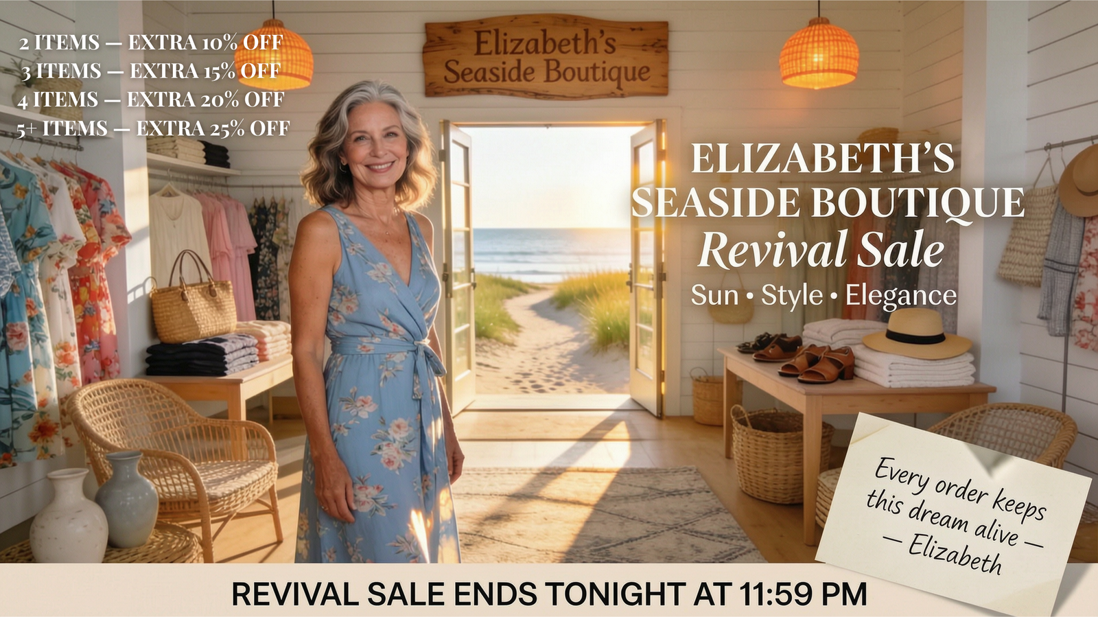 From the very beginning, I started with a simple dream, to create a place where women feel welcome, connected, and at home by the coast. Your support helped Elizabeth's Seaside Boutique grow into something truly meaningful.